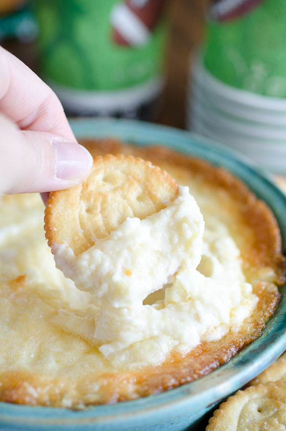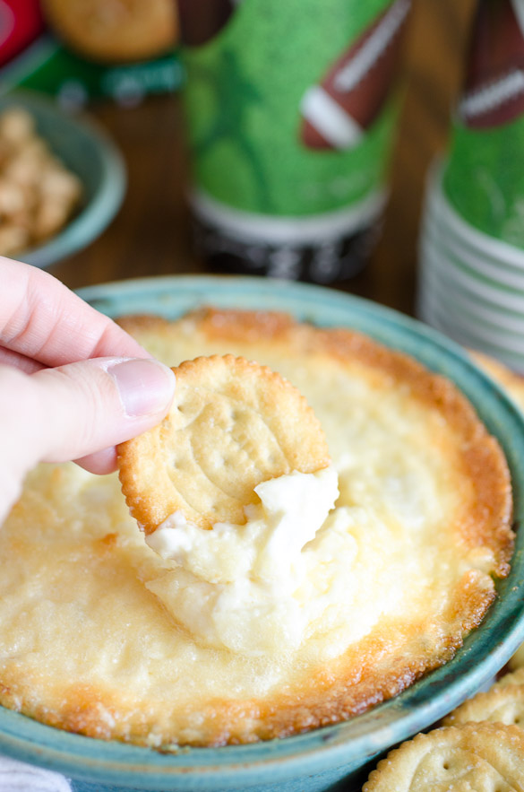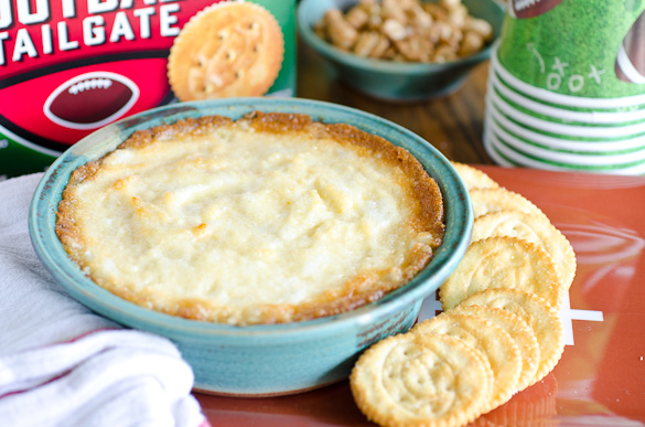 With football season upon us, this is the perfect easy dip recipe to serve your tailgating friends. I always serve this baked onion dip with buttery Ritz crackers because they are my favorite. I also love the football designed crackers they stock on the shelves this time of year! But, you can also serve this dip with pretzels, veggies, bread cubes, whatever floats your boat!