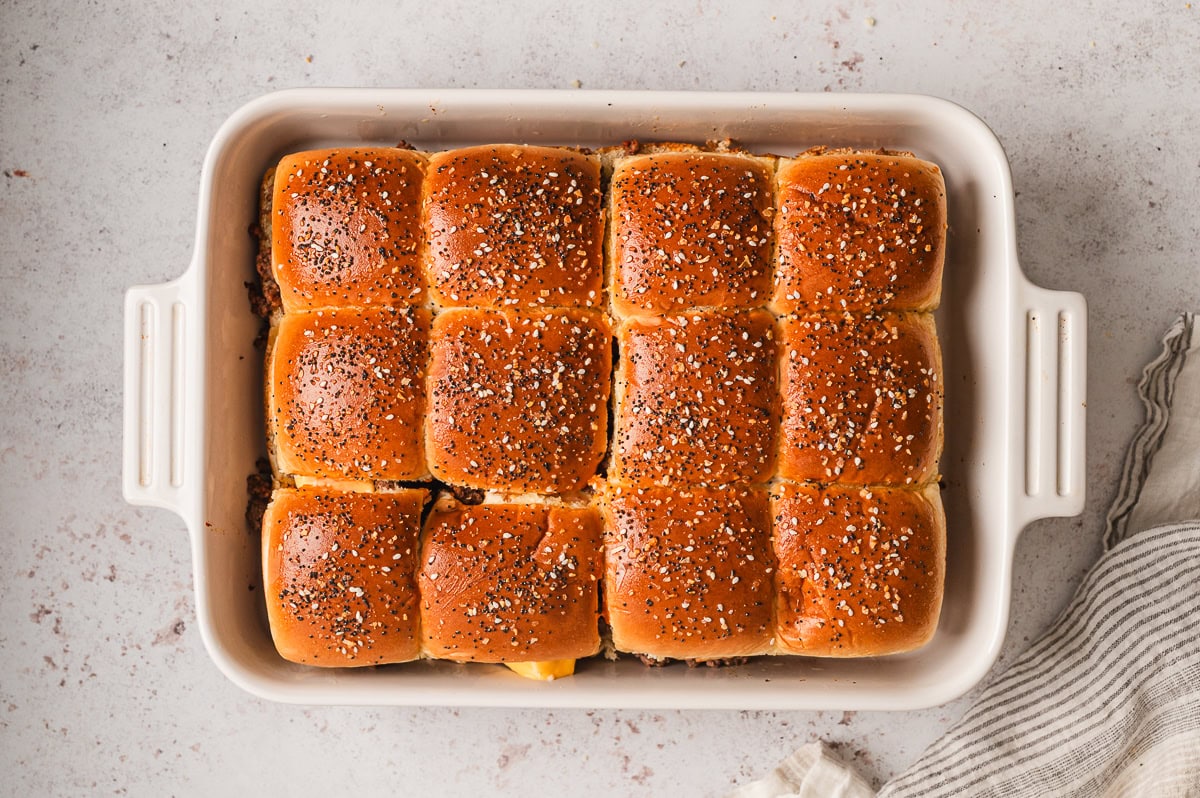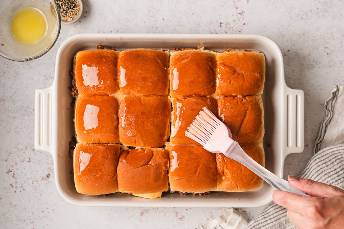 - Place the top halves of the rolls over the beef and cheese layer in the baking dish. Brush top with melted butter and sprinkle with everything bagel seasoning or sesame seeds (optional).