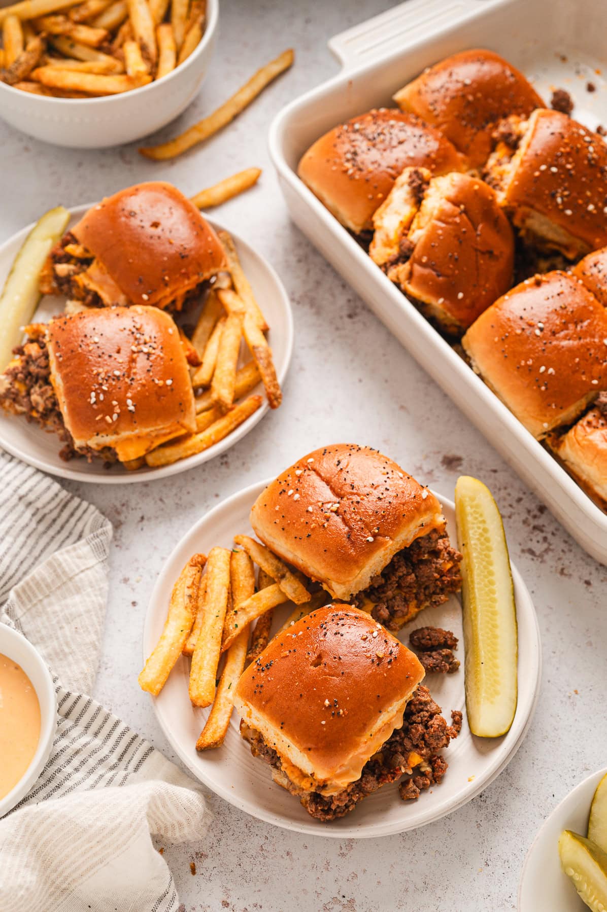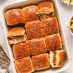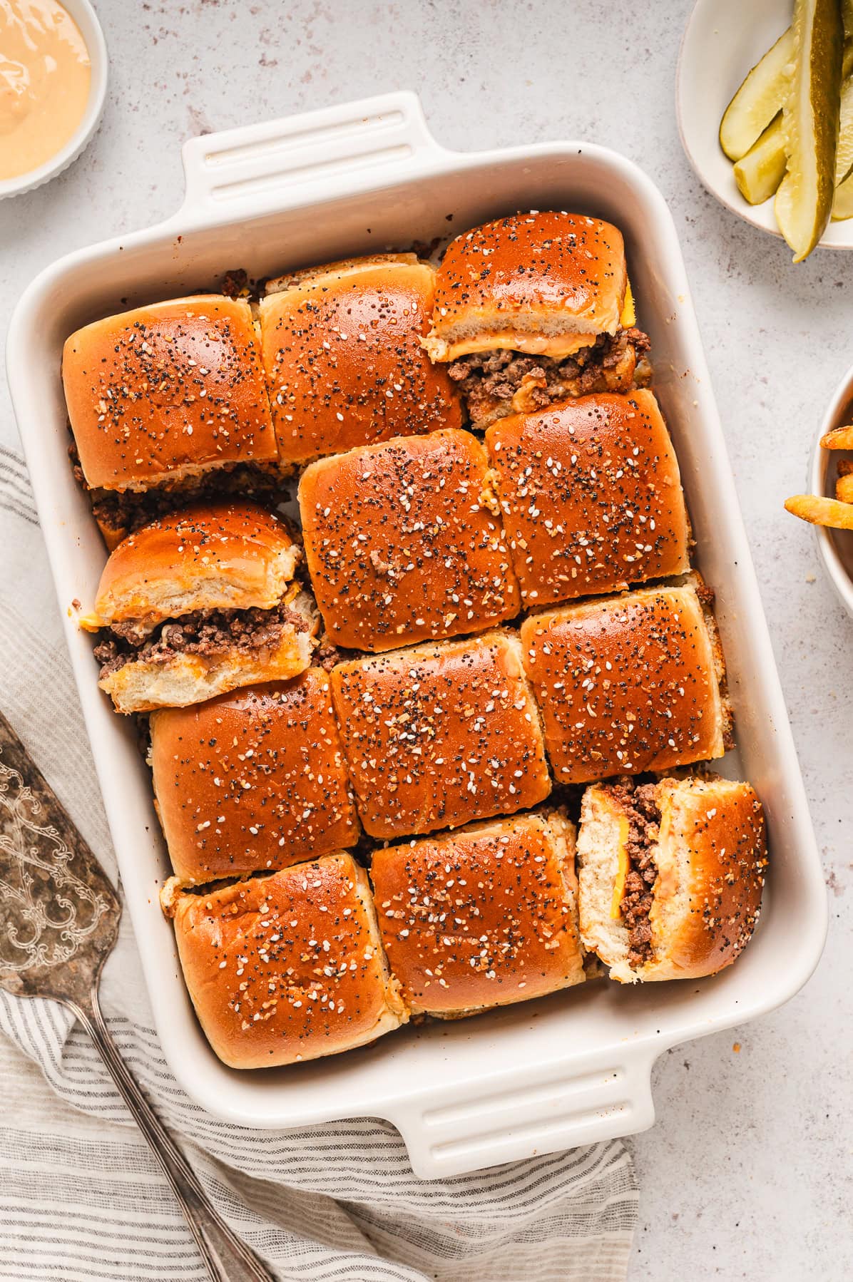 This recipe was originally published December 2024 and updated September 2025 with a reduction in cheese (5 slices instead of 10) and slightly less burger sauce. It was also modified to bake uncovered for the entire, shorter baking time to prevent soggy buns.