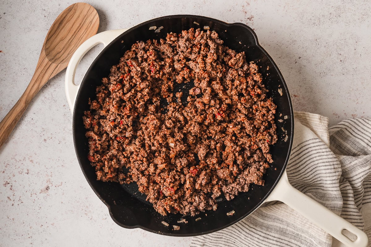 - Cook until the beef is browned and cooked through. Drain any excess grease.