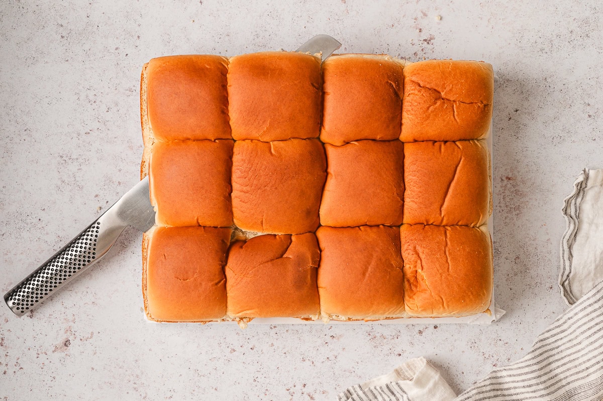 - Using a serrated bread knife, slice all 12 rolls in half horizontally, creating a top and bottom half for each roll. Keep the rolls connected in a single slab. Place the bottom halves of the rolls in a 9x13-inch baking dish.