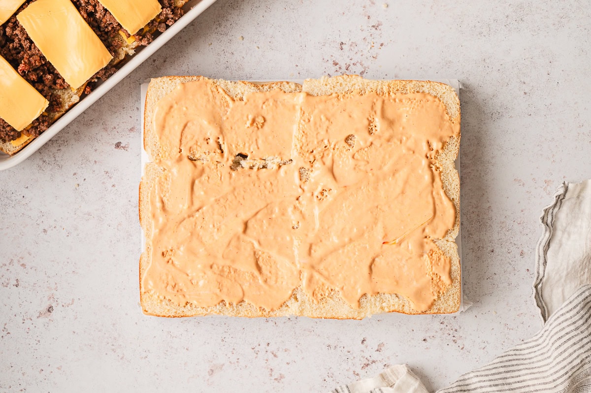 - Place the top halves of the rolls over the beef and cheese layer in the baking dish.