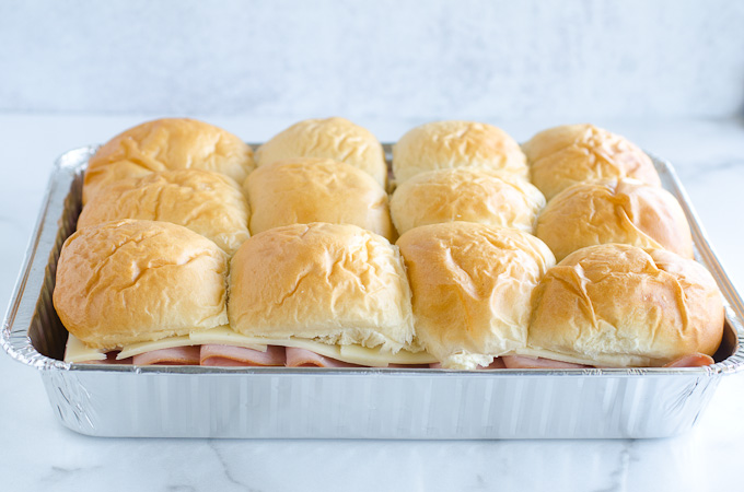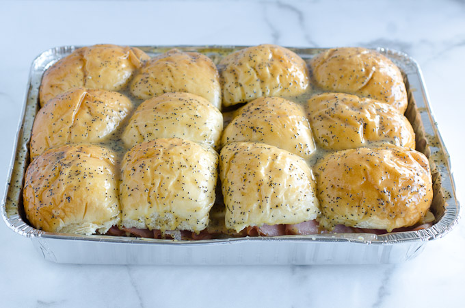 Hawaiian rolls sliders are easy to assemble using Hawaiian sweet rolls, deli ham and Swiss cheese. These savory sandwiches are baked until warm with a brush of a poppy seed butter mixture.