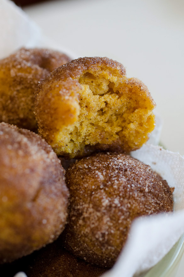 These pumpkin donuts were appropriate for celebrating the cool breeze flowing through my windows and the ability to turn on my oven without worrying about heating up the house. Yes, I said oven...another reason to love this recipe as the donuts are actually baked instead of fried. Technically, these are miniature muffins but after rolling them in the buttery cinnamon sugar mixture, they magically turn into cakey, sugary donut holes.