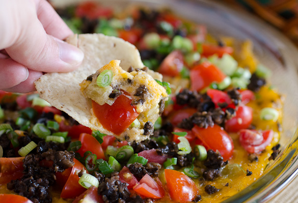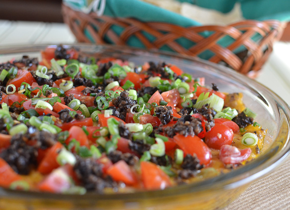 This year, we are hosting the party and I plan to figure out how to socialize, eat AND watch the game all at the same time. Plus, I have a few new appetizers already up my sleeve that can be prepped ahead of time so I don't need to spend all of my time in the kitchen. This one is a super easy dip that can be prepped up to 4 hours in advance, then thrown in the oven for just 20-30 minutes before topping with fresh tomatoes and green onions.