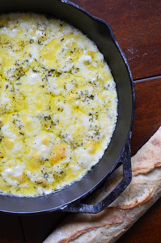 • Evenly distribute the Fontina cubes in a 12-inch cast-iron skillet or oven safe dish. Drizzle with the olive oil. In a small bowl, mix together the garlic, thyme and rosemary. Sprinkle over the cheese, along with the salt and pepper.