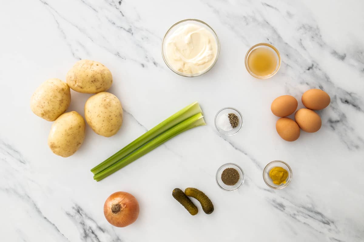 We use gold potatoes with a delicious creamy mayonnaise and mustard dressing. Below are the rest of the ingredients you need to make this classic potato salad recipe.