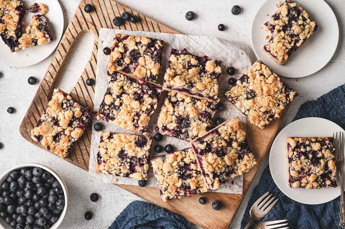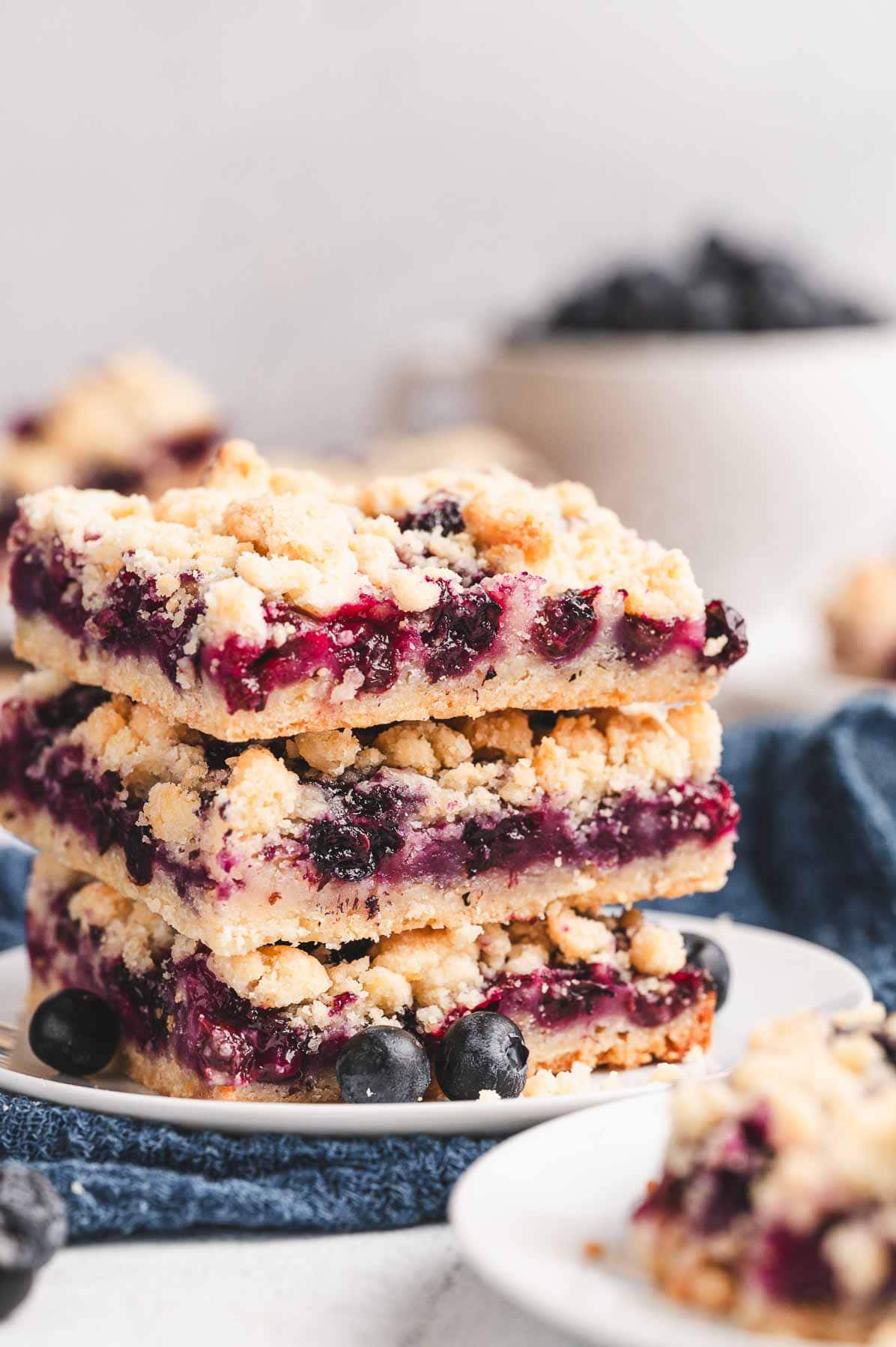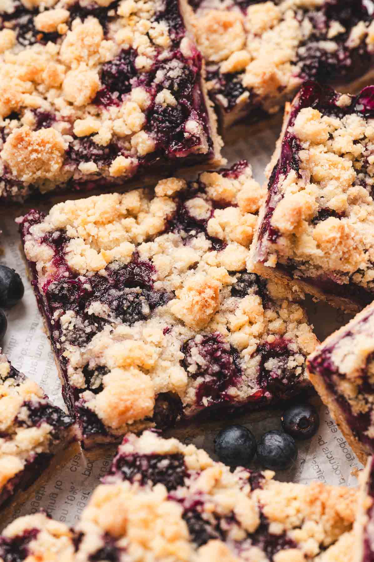 These blueberry pie bars are an easy dessert for blueberry lovers! Loaded with fresh blueberries, these bars capture all the flavors of classic blueberry pie with its buttery crumb topping.