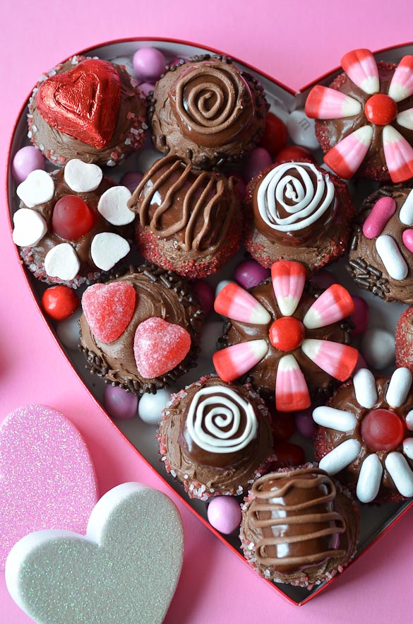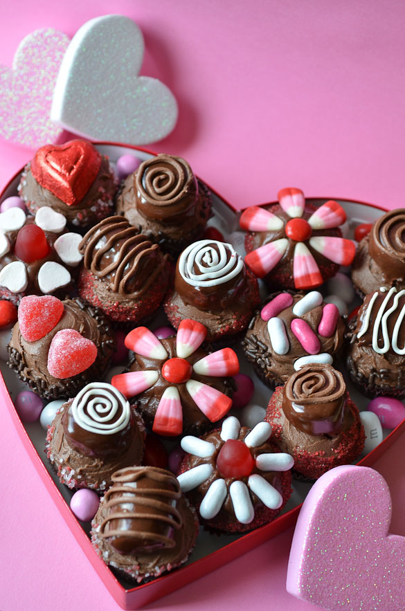 - Bake a batch of your favorite miniature chocolate cupcakes. (A box mix will do!) Once cupcakes are cooled, spread chocolate frosting over top. Decorate each one as desired with candies and drizzle with icing. Use photo as a guide. Serve in a heart shaped box.