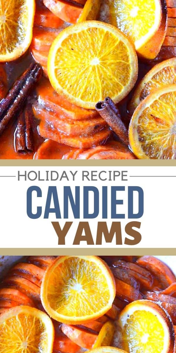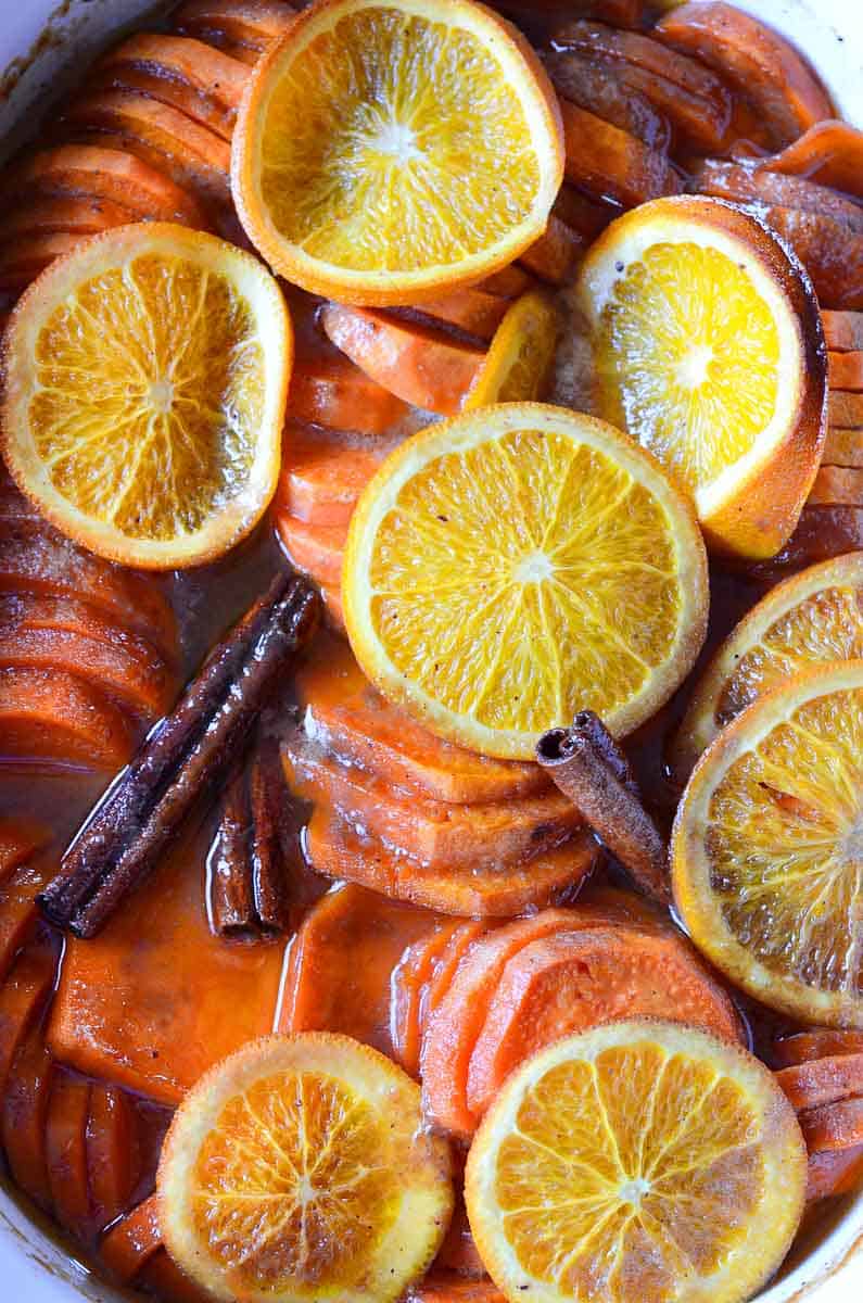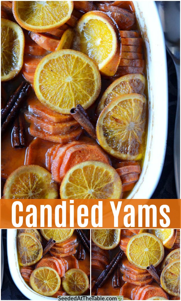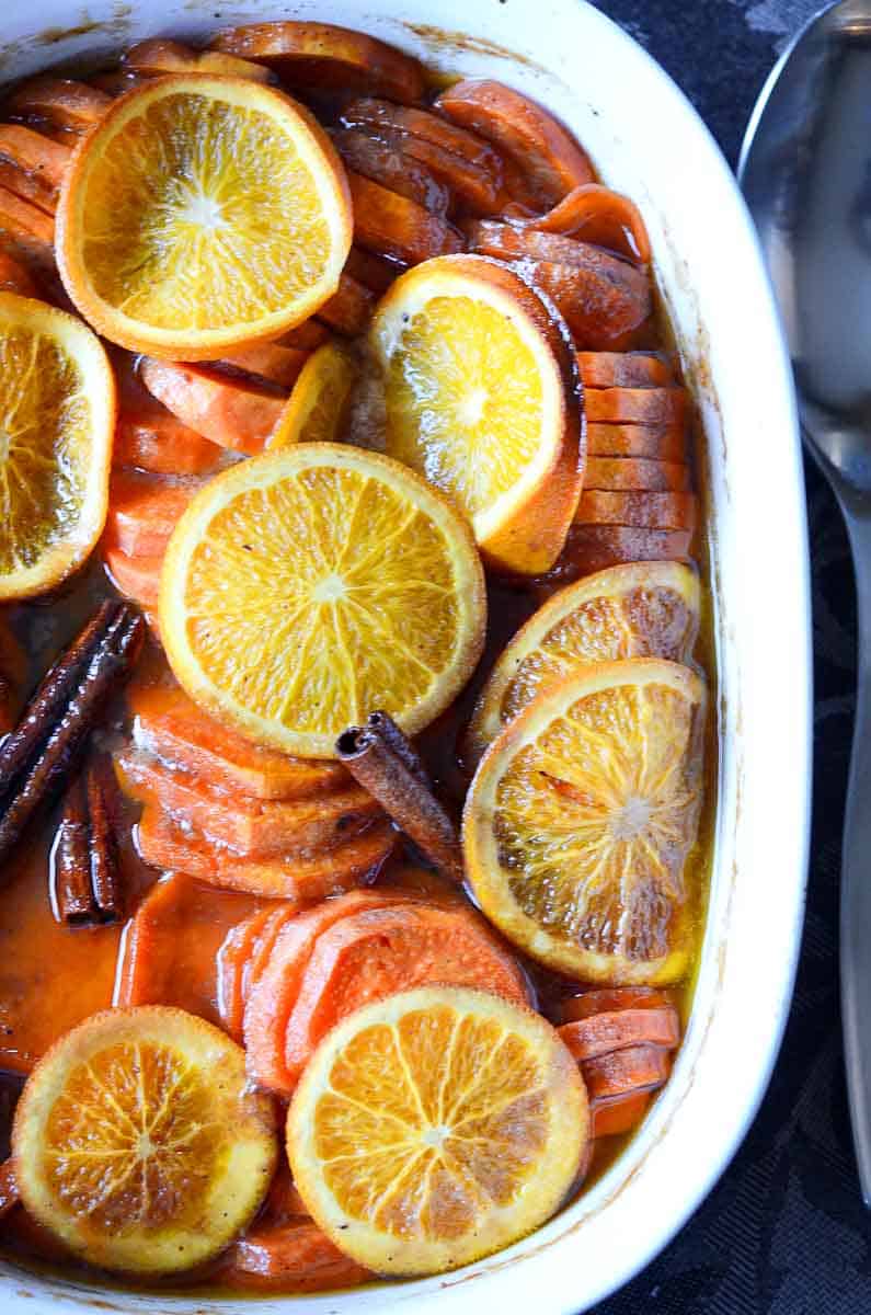 These candied yams are sliced sweet potatoes with brown sugar and spices baked with orange slices and cinnamon sticks. Easy AND impressive!