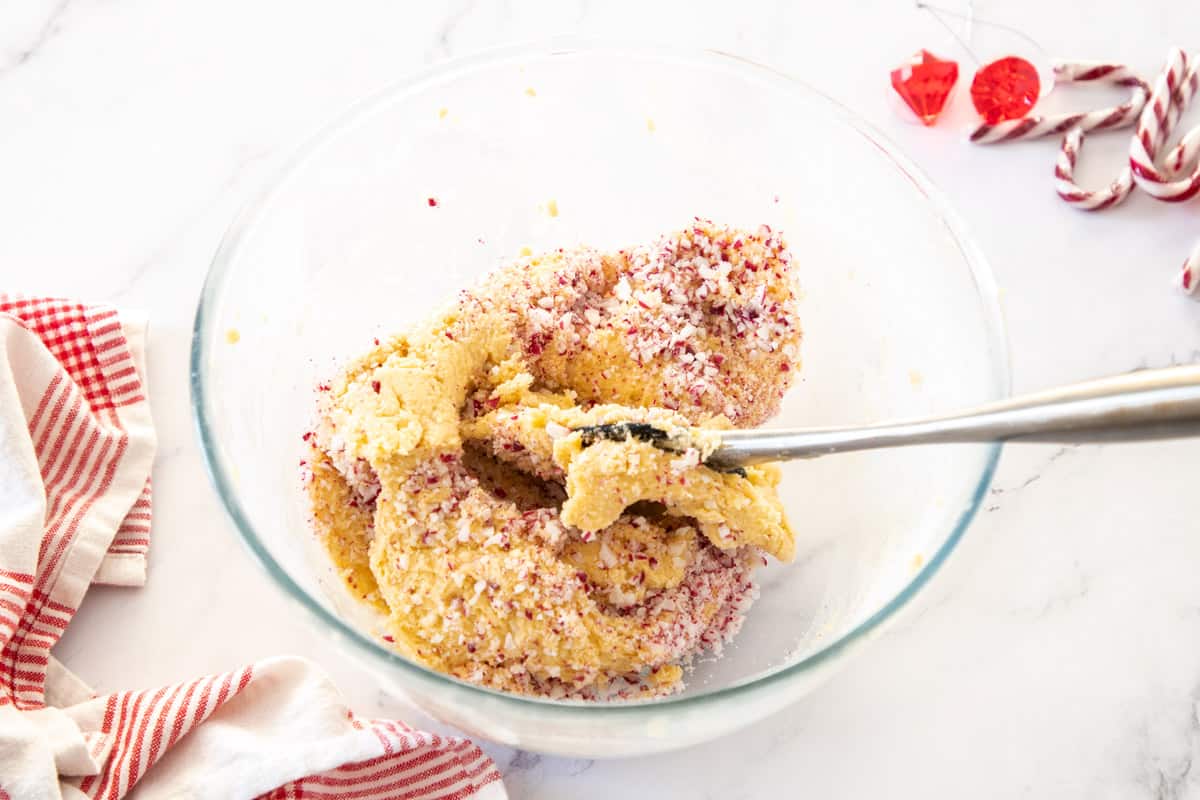 - Make sure candy canes are finely crushed with few, if any, chunks left before stirring into the dough. The chunks of candy cane can make it difficult to slice the logs. (The candy cane pieces to TOP the white chocolate is fine in bigger chunks.)