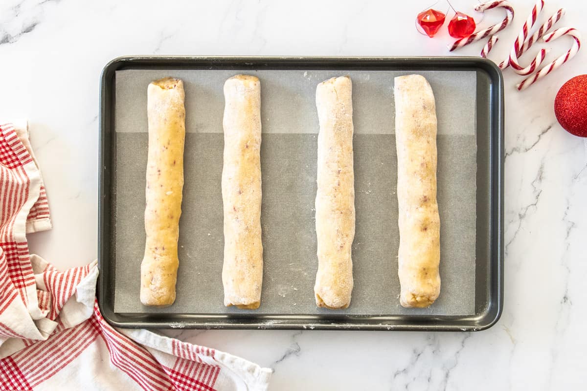 - Divide dough into 4 even pieces on a lightly floured surface. Shape each piece into 9- x 1 ½-inch round log. Place logs 3 inches apart onto prepared baking sheet.