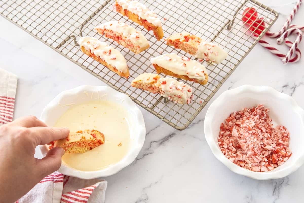 - Dip cooled biscotti into melted white chocolate and top with additional crushed candy.