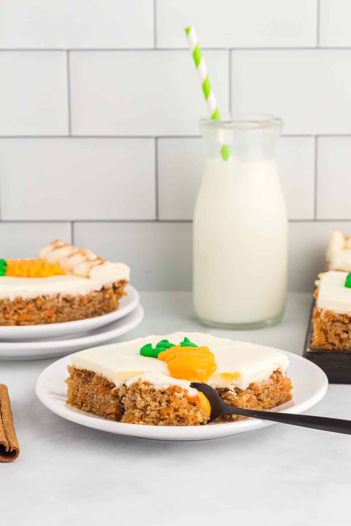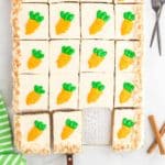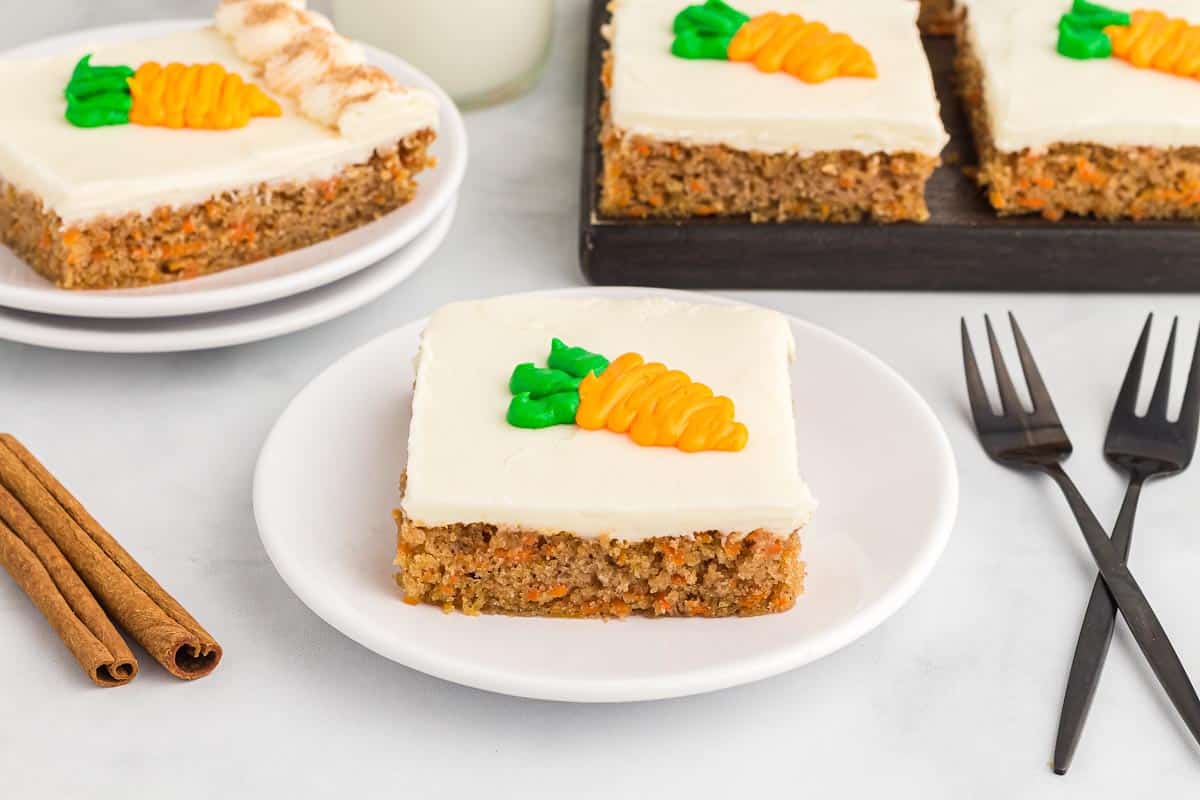 This easy carrot cake recipe is made in a sheet pan. We love sheet pan cakes, especially this moist and delicious carrot cake recipe with a cream cheese frosting!