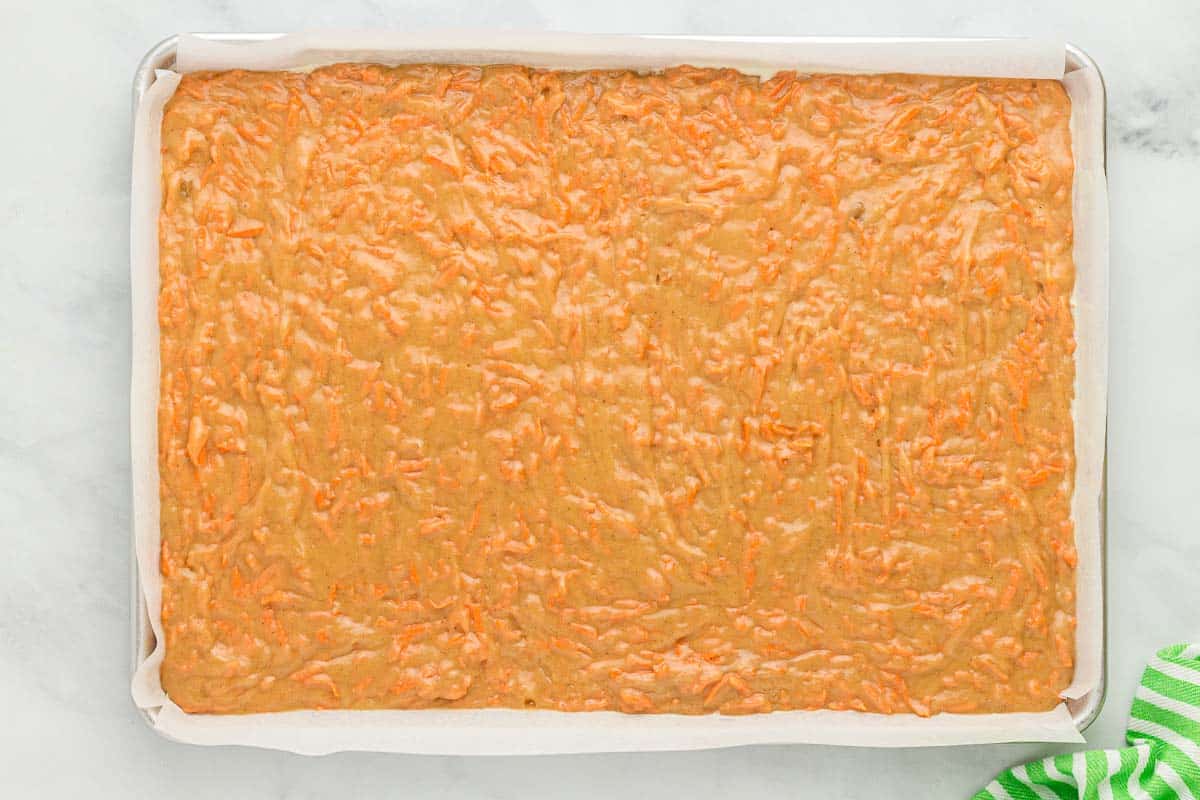- Pour the batter into the prepared baking sheet. Use the rubber spatula to spread evenly in the pan.