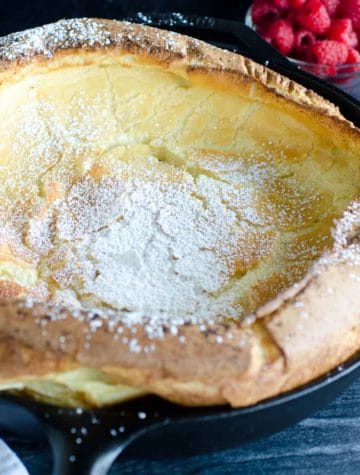 dutch baby german pancake in cast iron skillet with powdered sugar