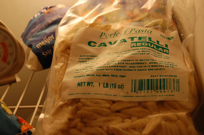 I had a hard time finding cavatelli pasta in the grocery store. If you are not familiar with it, the pasta resembles the denseness of gnocchi, but the size of a small penne. When a store carries it, you can find it in the frozen food aisle. I finally found it at a fresh market across the street from work. They must've just started carrying it, because I've looked there many times before!!