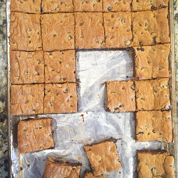 I like that these are baked in one pan then cut into squares as opposed to traditional cookies where you have to wait for a batch to bake before you can bake another batch (or two). This way, the cookies are done and you can cut them right away or wait for them to cool before all the kids come running to grab a square (or two). 🙂