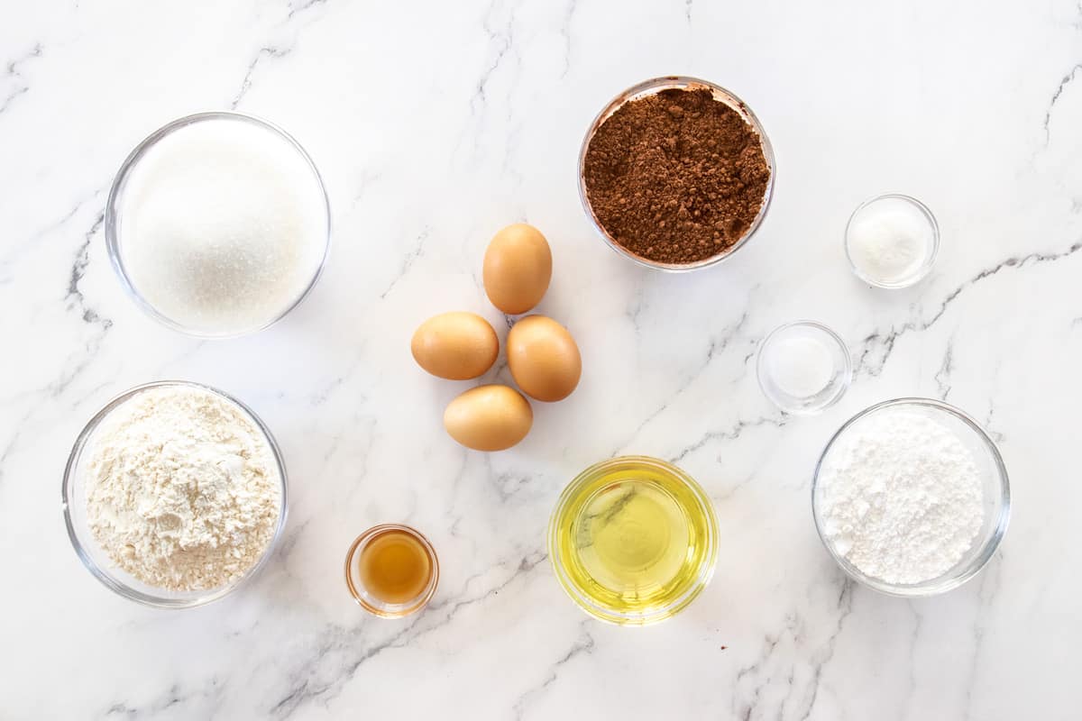 - In a large mixing bowl, combine the cocoa, 2 cups granulated sugar, and oil with a wooden spoon. Beat in eggs one at a time, then the vanilla. In a separate medium bowl, whisk together the flour, baking powder, and salt; stir into the cocoa mixture.