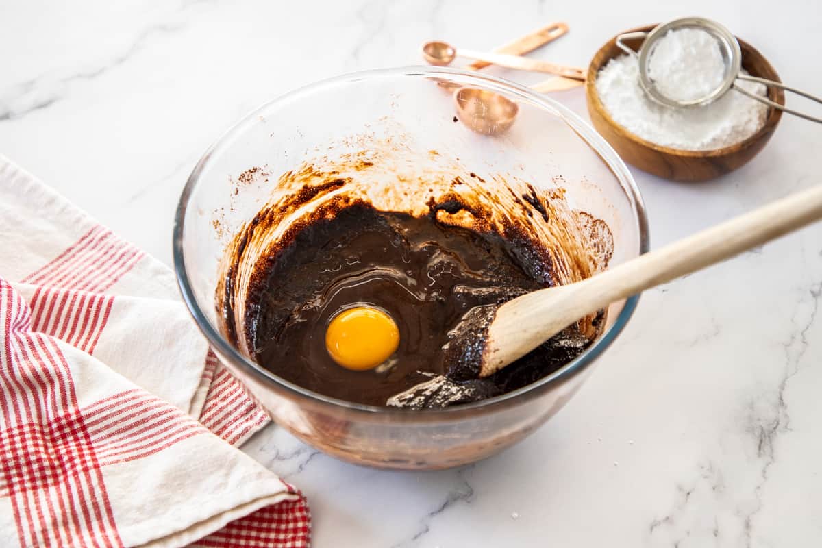 - In a separate bowl, whisk flour, baking powder and salt. Stir into the bowl of cocoa mixture.