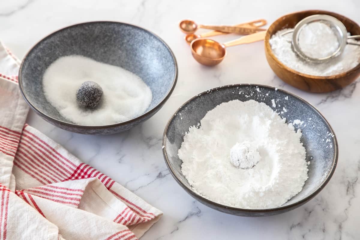 - Place powdered sugar and additional ⅓ cup granulated sugar in two separate small bowls. Using a small cookie scoop, spoon one inch dough balls into bowl of granulated sugar. Coat each ball in the granulated sugar and then generously with the powdered sugar. Place onto prepared cookie sheets. (Keep leftover dough chilled in fridge between batches.)