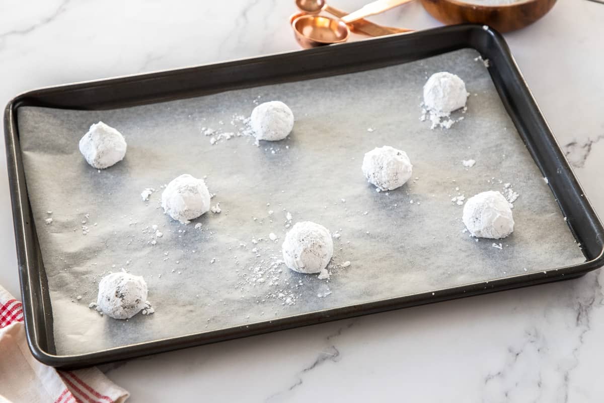 - Use cookie scoop to spoon dough balls into bowl of granulated sugar. Coat each dough ball with granulated sugar and then with powdered sugar before placing on baking sheet.