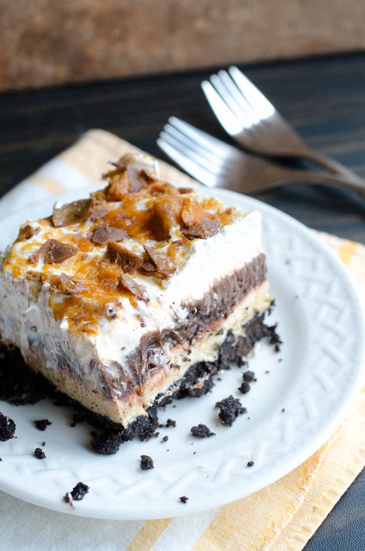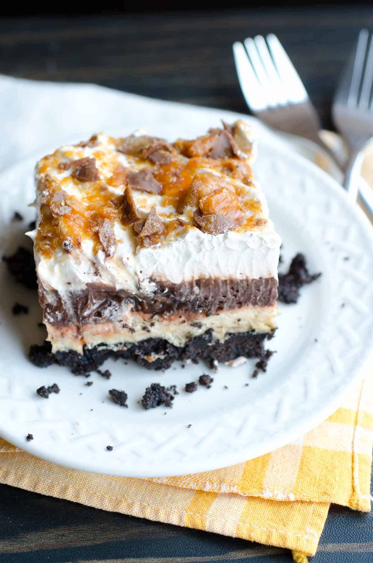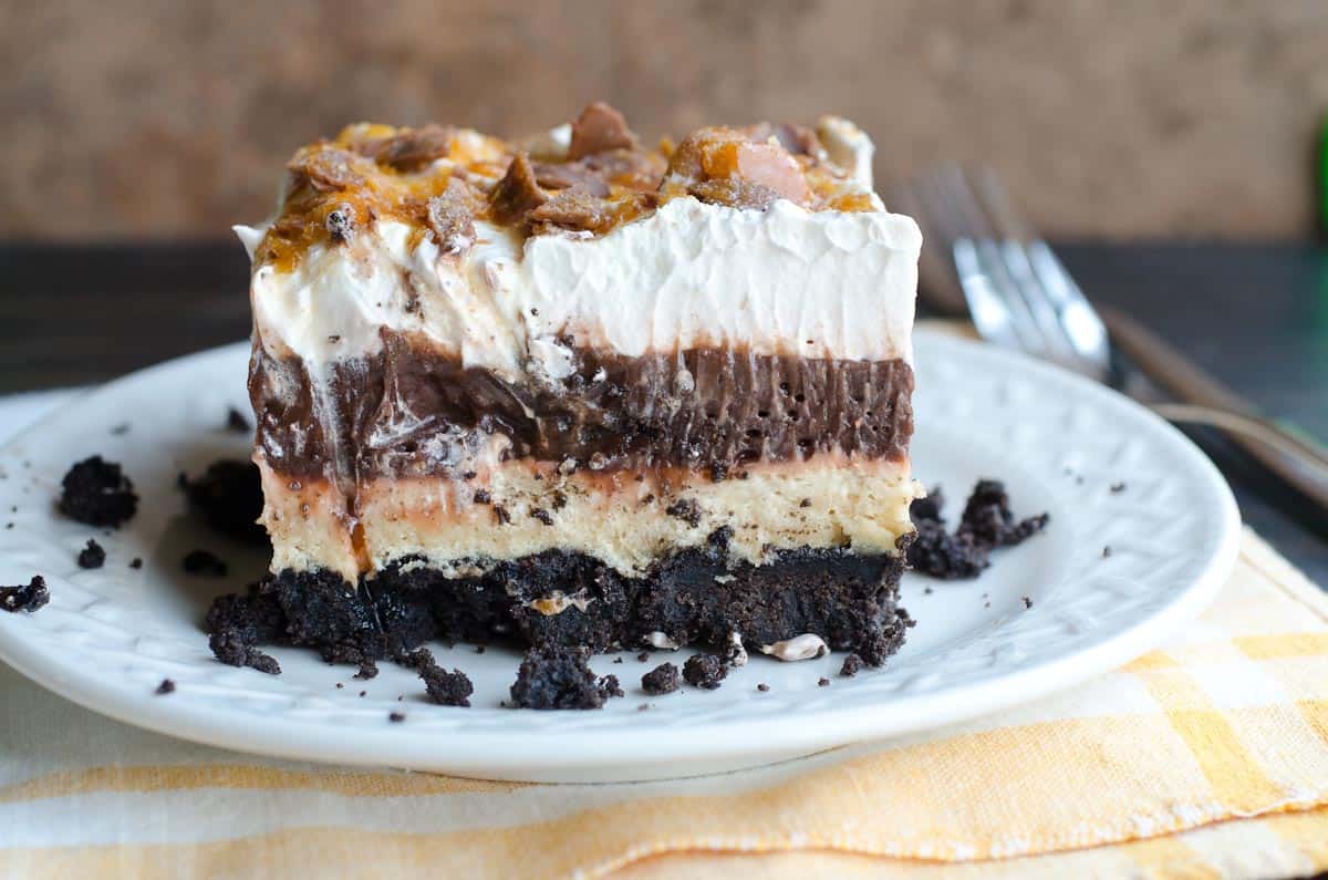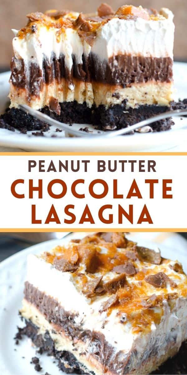 Peanut butter chocolate lasagna includes layers of Cool Whip, chocolate pudding and creamy peanut butter cream cheese over an Oreo crust. Topped with crushed Butterfingers, this Oreo dessert is the BEST!