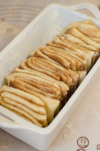 - Layer the dough slices into the loaf pan like a flip book (as Joy the Baker puts it). Cover with a towel and allow to rise in a warm place for 45 minutes, or almost doubled in size.