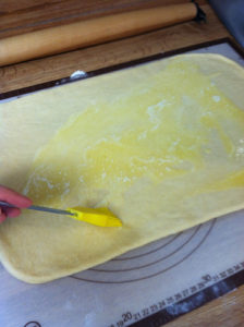 - Spread the melted butter across the surface of the dough, then sprinkle evenly with the cinnamon sugar mixture. All of it.