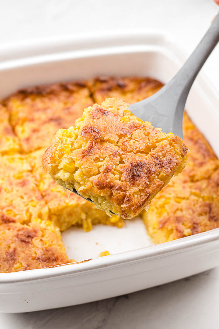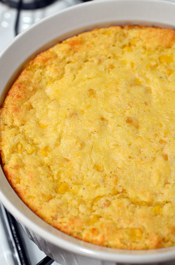Some people like to top their corn casserole with cheese, but I like to stir it into the mix instead. You can also leave out the cheese altogether. It's really just a preference thing, so you can decide. I just don't like to cover up the yummy crackly corn bread with greasy looking melted cheese. But, hey, I'm not going to try and sway your opinion. 🙂