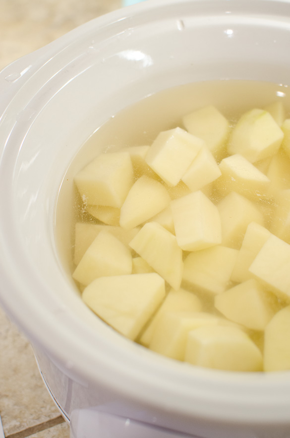 - Place chopped potatoes in 6 quart slow cooker. Pour water or chicken broth over top until potatoes are just covered. Cook on high, covered, 4 hours until potatoes are fork tender.