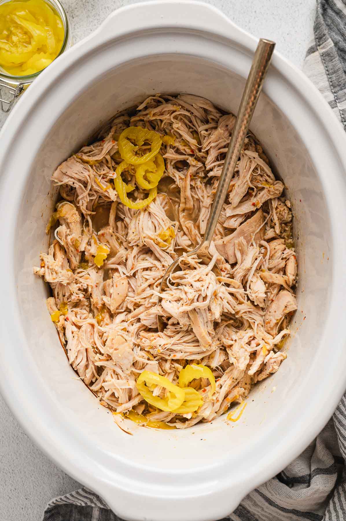 This crockpot Italian chicken is the most flavorful shredded chicken, with its combination of Italian seasonings and slight kick from pepperoncini. Simply cook, shred the chicken, and serve over pasta or rice. We also use this chicken to make "Italian beef" style sandwiches on hoagie rolls for a quick weeknight dinner.