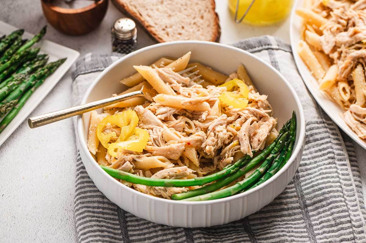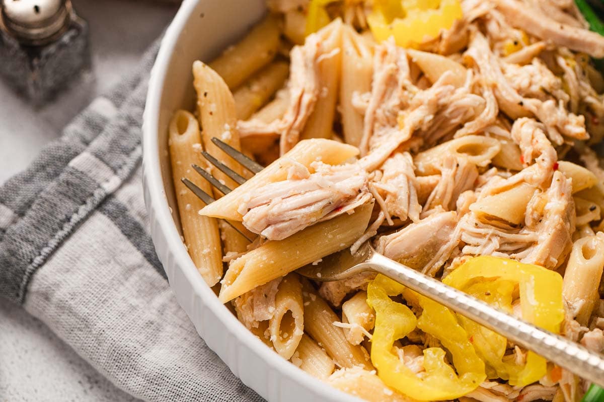 When we decide to use this shredded Italian chicken for a pasta dish, we transfer the chicken directly from the crockpot onto our dinner plates over a mound of pasta.