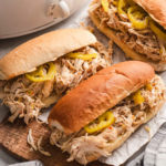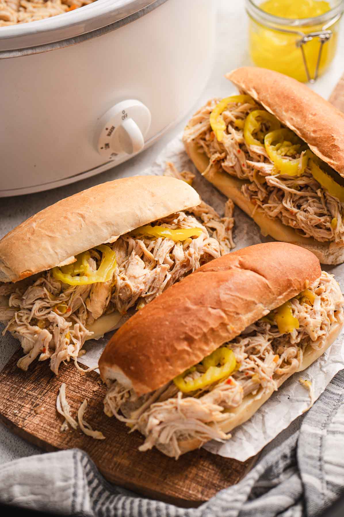 For Italian chicken subs, I first toast the hoagie rolls in a 400°F oven with a slice of provolone. Then fill each hoagie with hot chicken and peppers from the slow cooker bowl and serve!