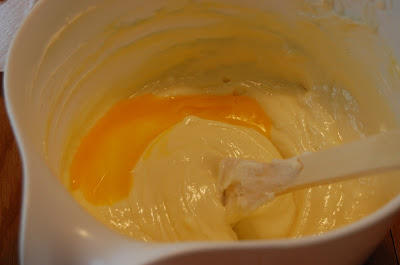 Add the whole eggs and the egg yolks, one at a time, beating well (but still at low speed) after each addition. Beat in the vanilla and cream.