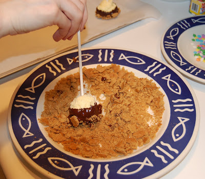 The recipe also gives suggestions for dipping your chocolate covered pops in assorted decorations. I didn't use any of the suggestions, because I thought these pops could use a "crust" as in normal cheesecakes. So, I dipped them in crushed graham crackers which worked out very well! The only problem with this choice, though, is I would suggest waiting to dip them in the chocolate and graham crackers until just before serving them. The chocolate dries fast enough, so that shouldn't be a problem. The issue would be if you dipped them ahead of time, you need to keep them refrigerated, but I think the graham crackers would become soggy in the fridge.