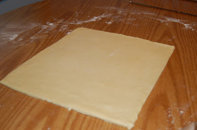 2. After the detrempe has chilled 30 minutes, turn it out onto a lightly floured surface. Roll the dough into a rectangle approximately 18 x 13 inches and ยผ inch thick. The dough may be sticky, so keep dusting it lightly with flour.