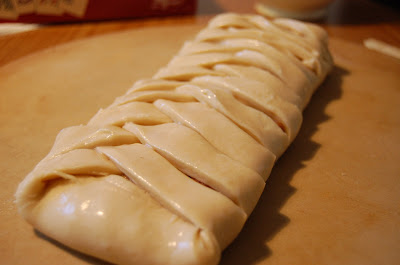Starting with the top and bottom โflapsโ, fold the top flap down over the filling to cover. Next, fold the bottom โflapโ up to cover filling. This helps keep the braid neat and helps to hold in the filling. Now begin folding the cut side strips of dough over the filling, alternating first left, then right, left, right, until finished. Trim any excess dough and tuck in the ends.