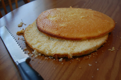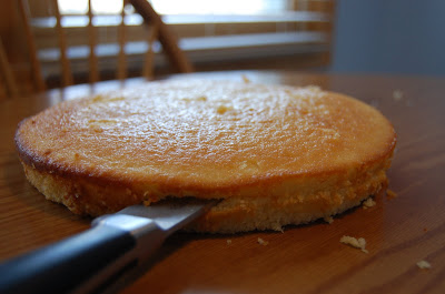 Using a sharp serrated knife and a gentle sawing motion, slice each layer horizontally in half.