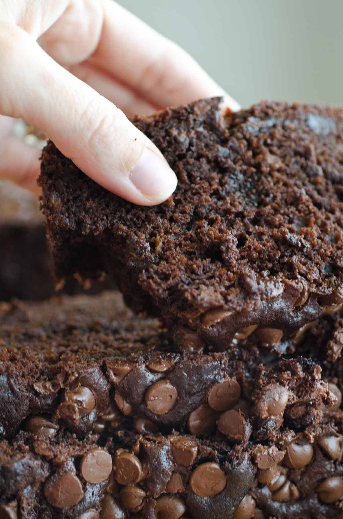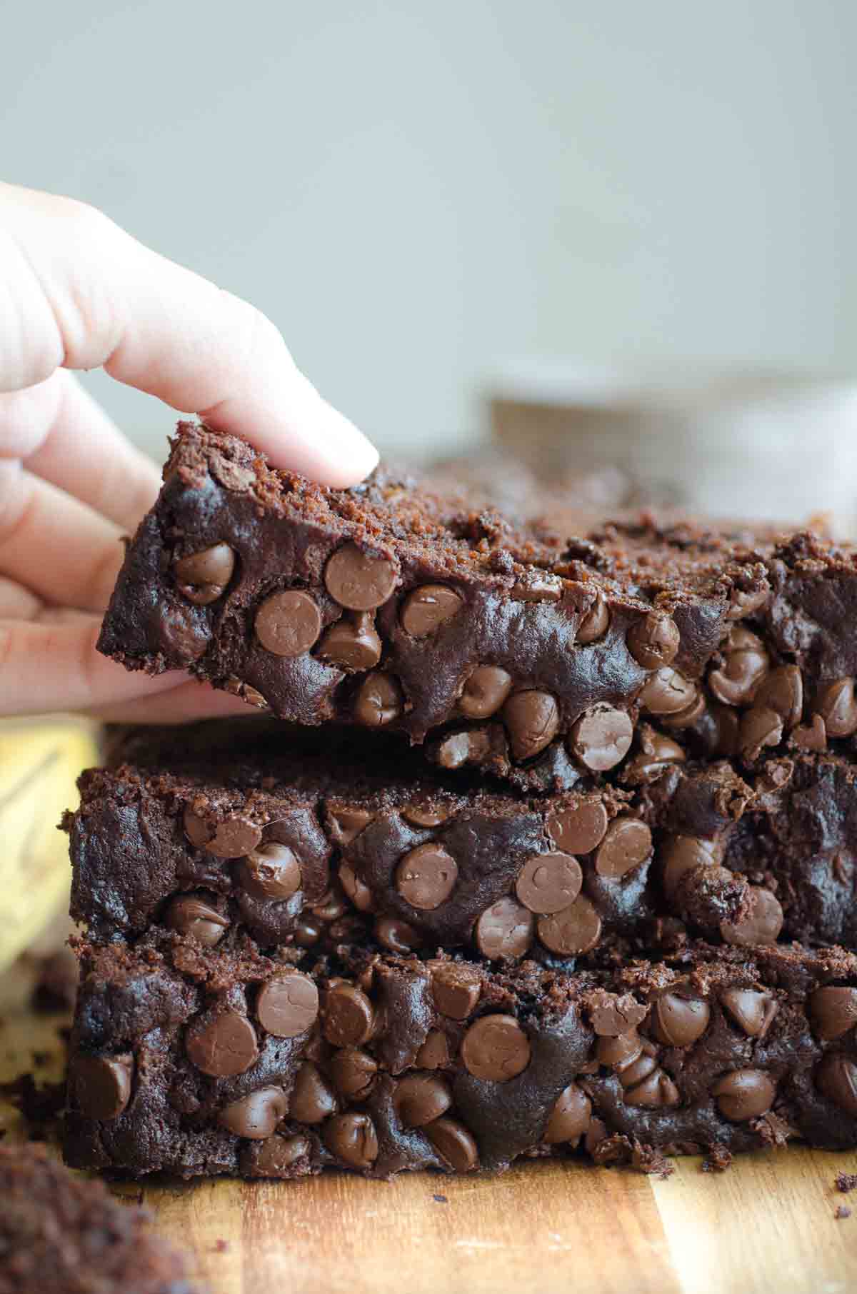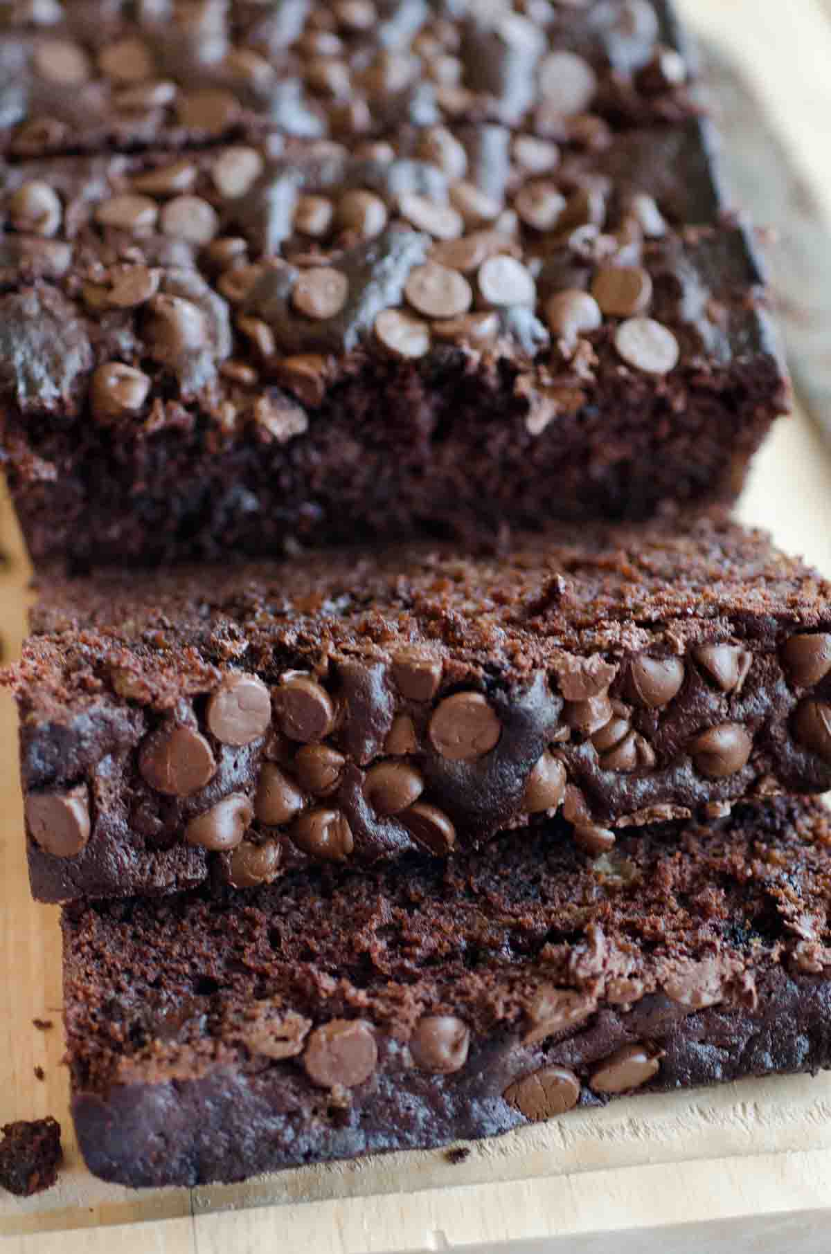 This chocolate banana bread is super moist, yet hearty and stable to hold its shape when sliced. Loaded with chocolate chips for the chocolate lover's dream!