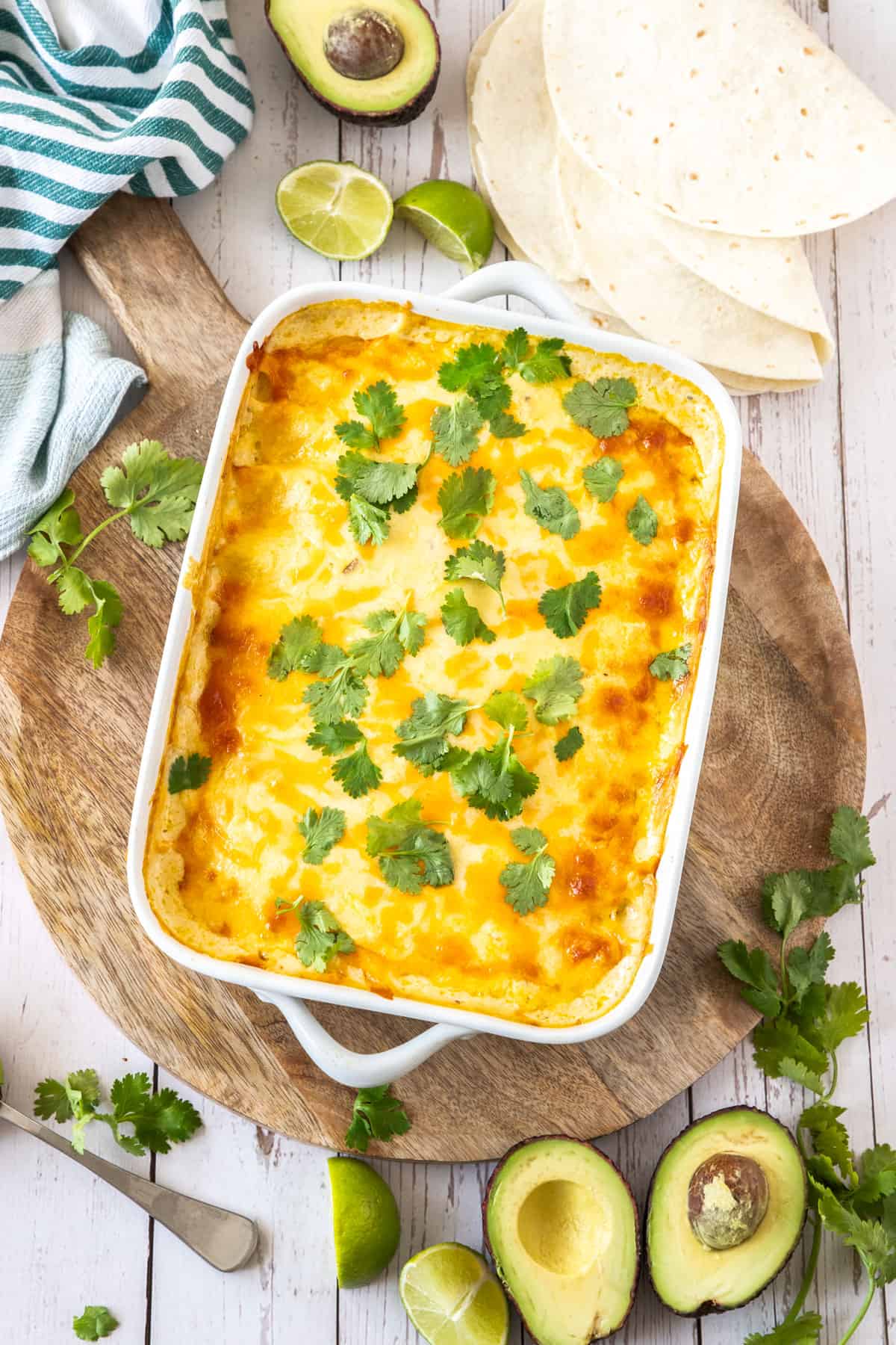 Make-ahead: These chicken enchiladas can be assembled the day before and store in the fridge. When ready to bake, place in the oven while it is preheating then bake as directed in the recipe.