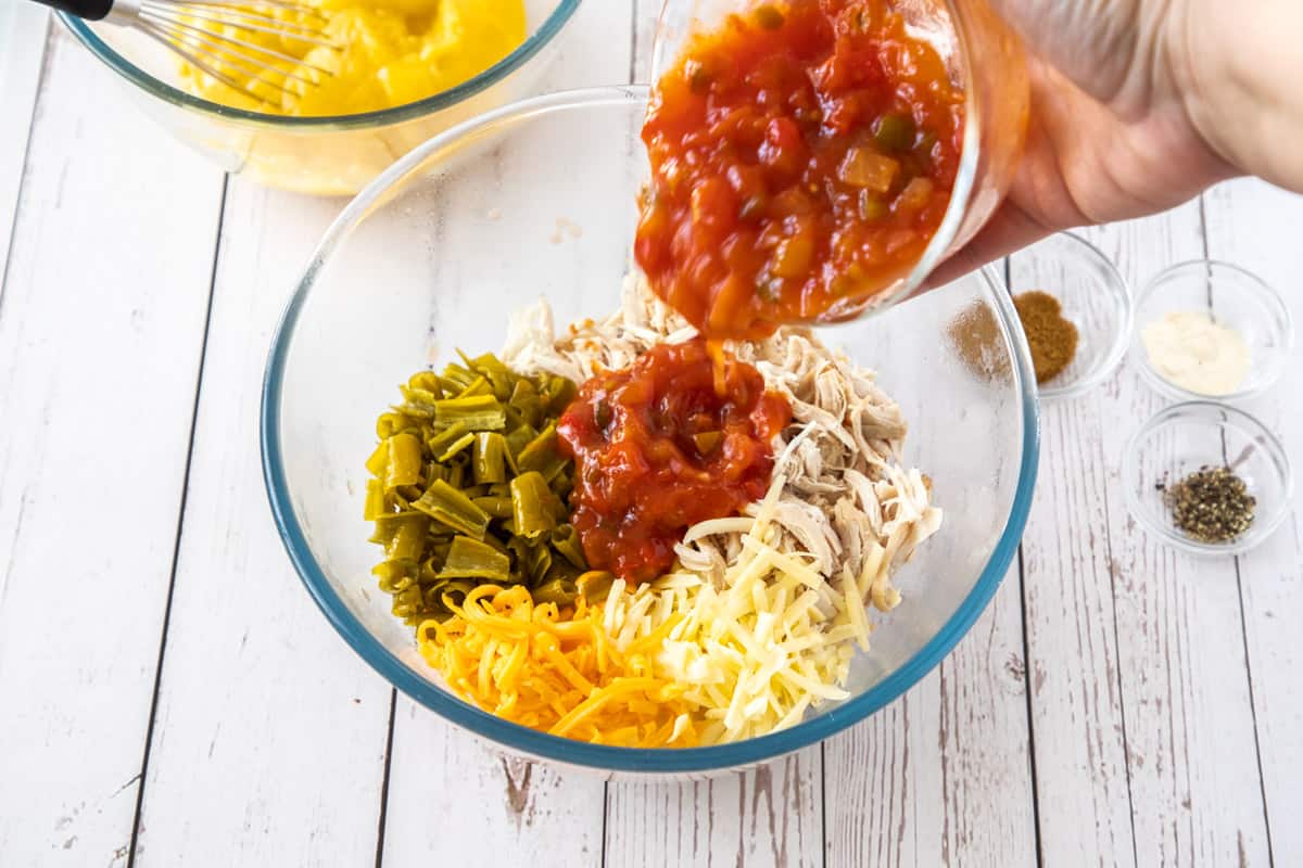 - Mix. In a large bowl, combine the chicken, salsa, green chiles and half of the cheese.