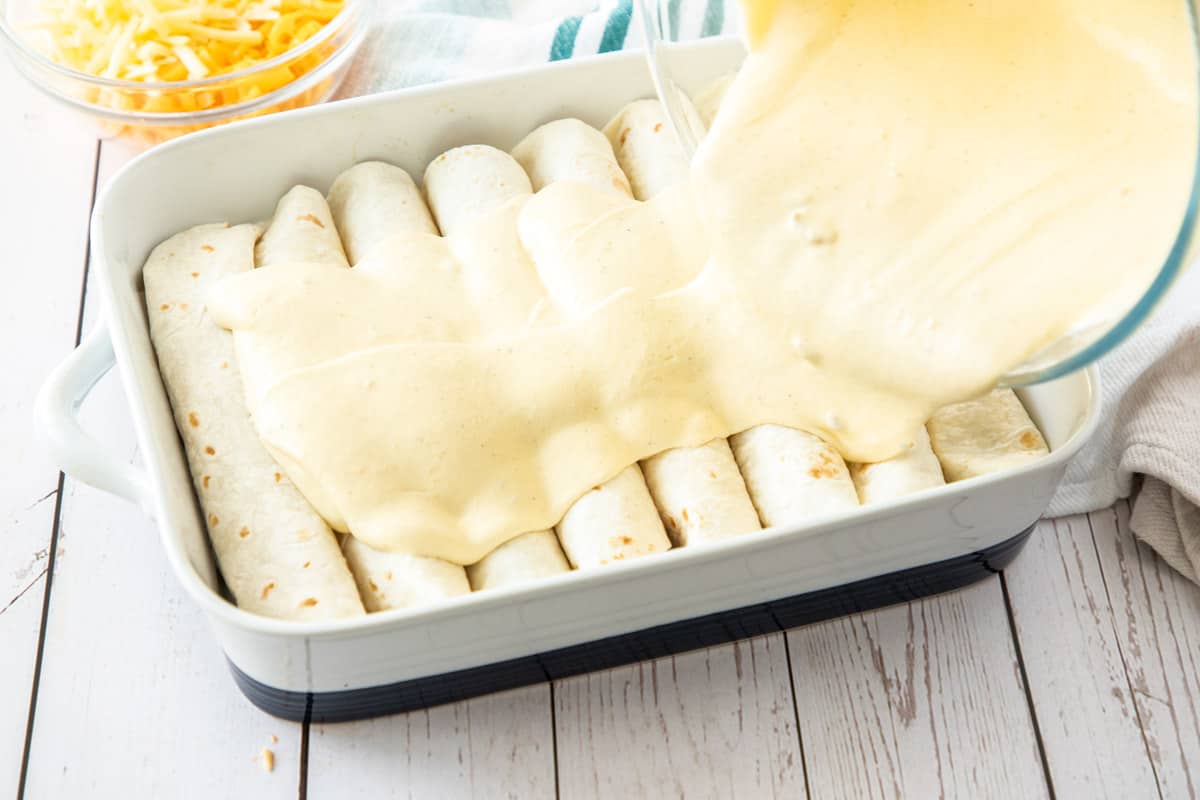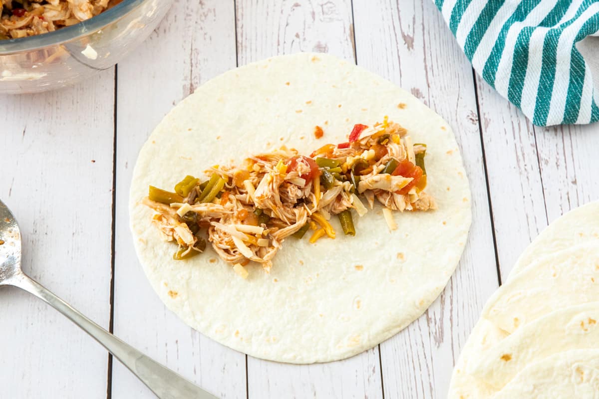 - Assemble. Divide chicken mixture evenly into the center of each tortilla. Tightly roll and place seam side down in baking dish.
