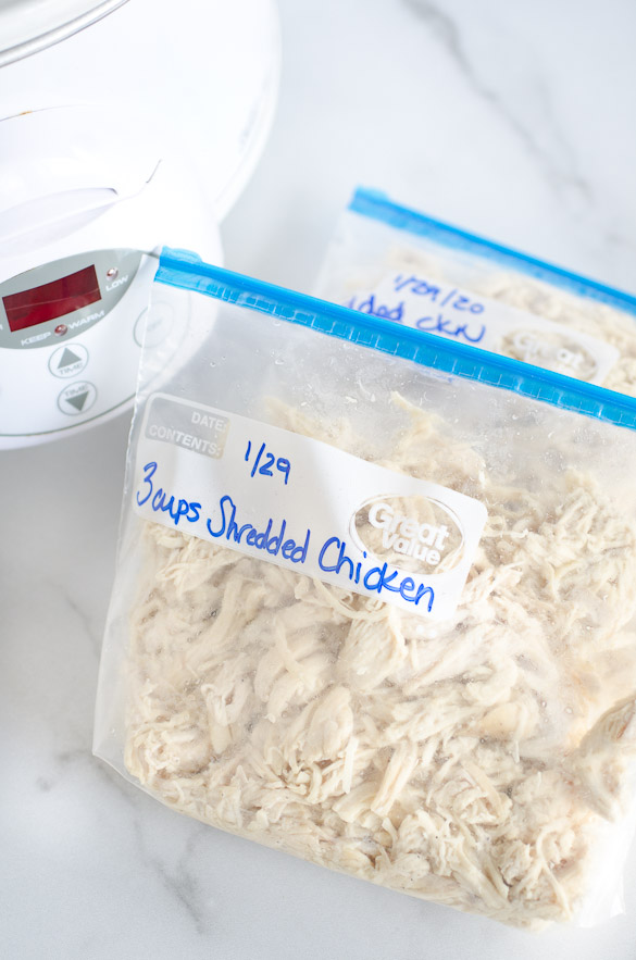 After shredding the chicken, I'll use what I need for that night then will store the rest in 2 cup portions in freezer bags. If I know I'll use some of it within the next few days, then I'll keep that portion in a sealed container in the refrigerator.