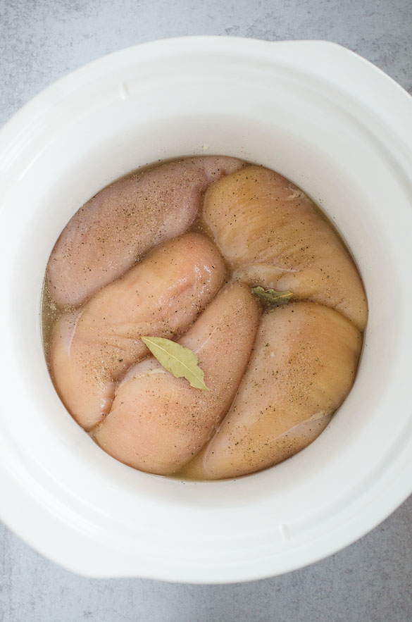 - Place chicken breasts into bowl of slow cooker. Season with salt and pepper. Add bay leaf and pour in broth.