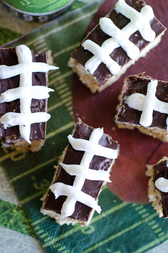 - Refrigerate for 30 minutes or until set. Cut into bars, 4 rows by 5 rows. Add decorative football stripes with white icing (optional). Serve at room temperature.