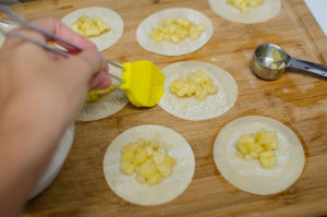 • While the oil is heating up to the right temperature, prepare the pies. Working in batches, place just under a Tablespoon of the apple pie filling into the center of each wonton. Brush water around the edges of the wonton and fold over to seal.