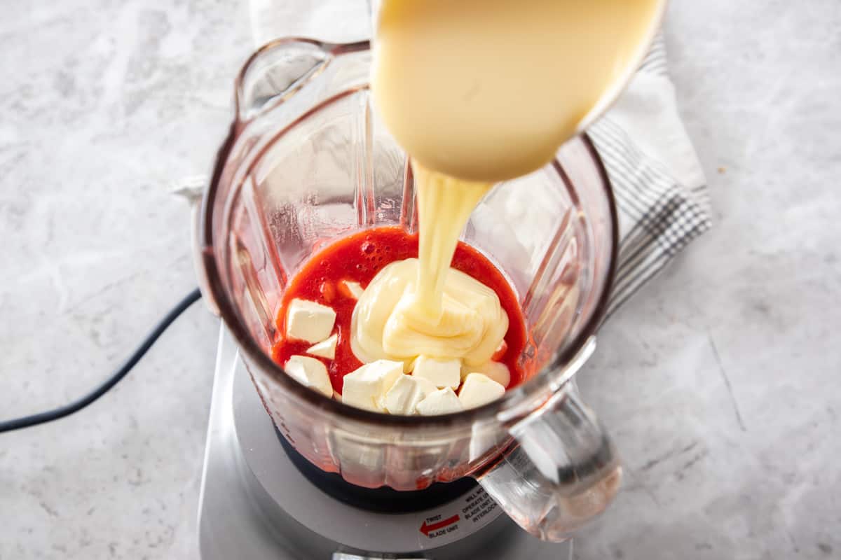 - Puree whole strawberries in a blender (scrape sides of bowl and process a couple of times until almost smooth...it's ok if a few chunks of strawberries are left). Add vanilla, condensed milk and cream cheese to the blender and pulse until just combined. Fold in the Cool Whip, then diced strawberries.