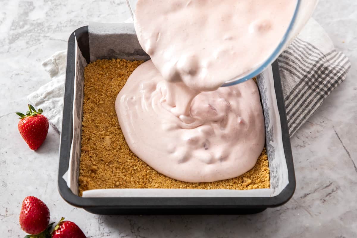 - Spread strawberry mixture evenly over the graham cracker crust in the pan. Sprinkle remaining graham cracker crumbs evenly over top.