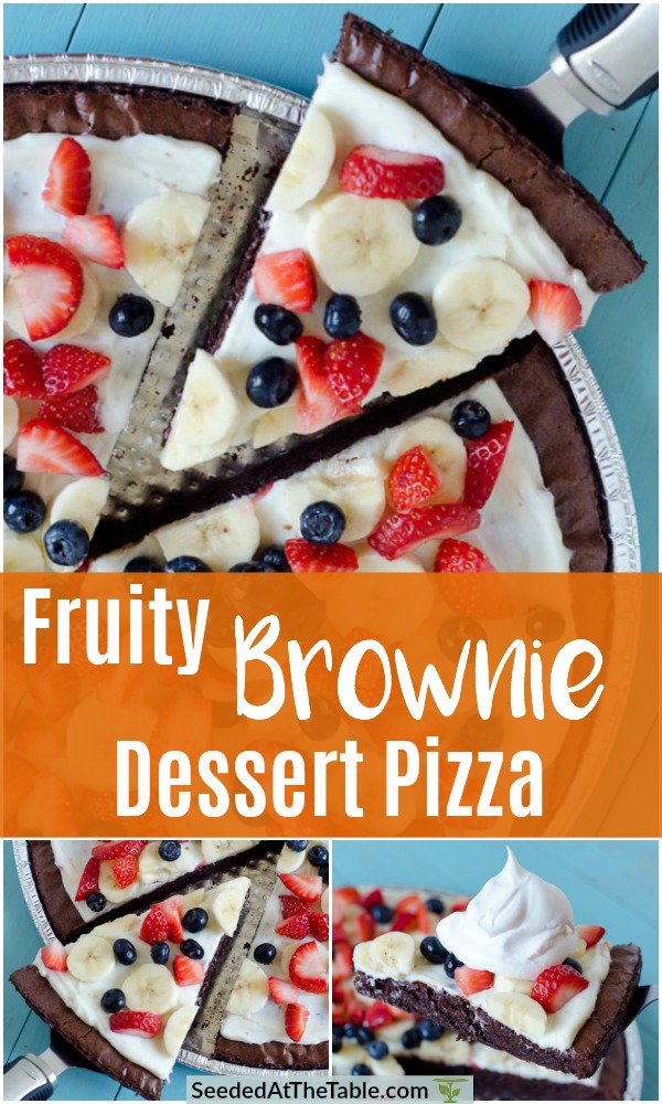 This Fruity Brownie Dessert Pizza comes together quickly with a boxed brownie mix and a fruity cream cheese frosting. Top off with a dollop of whipped cream and you have the easiest dessert ever!